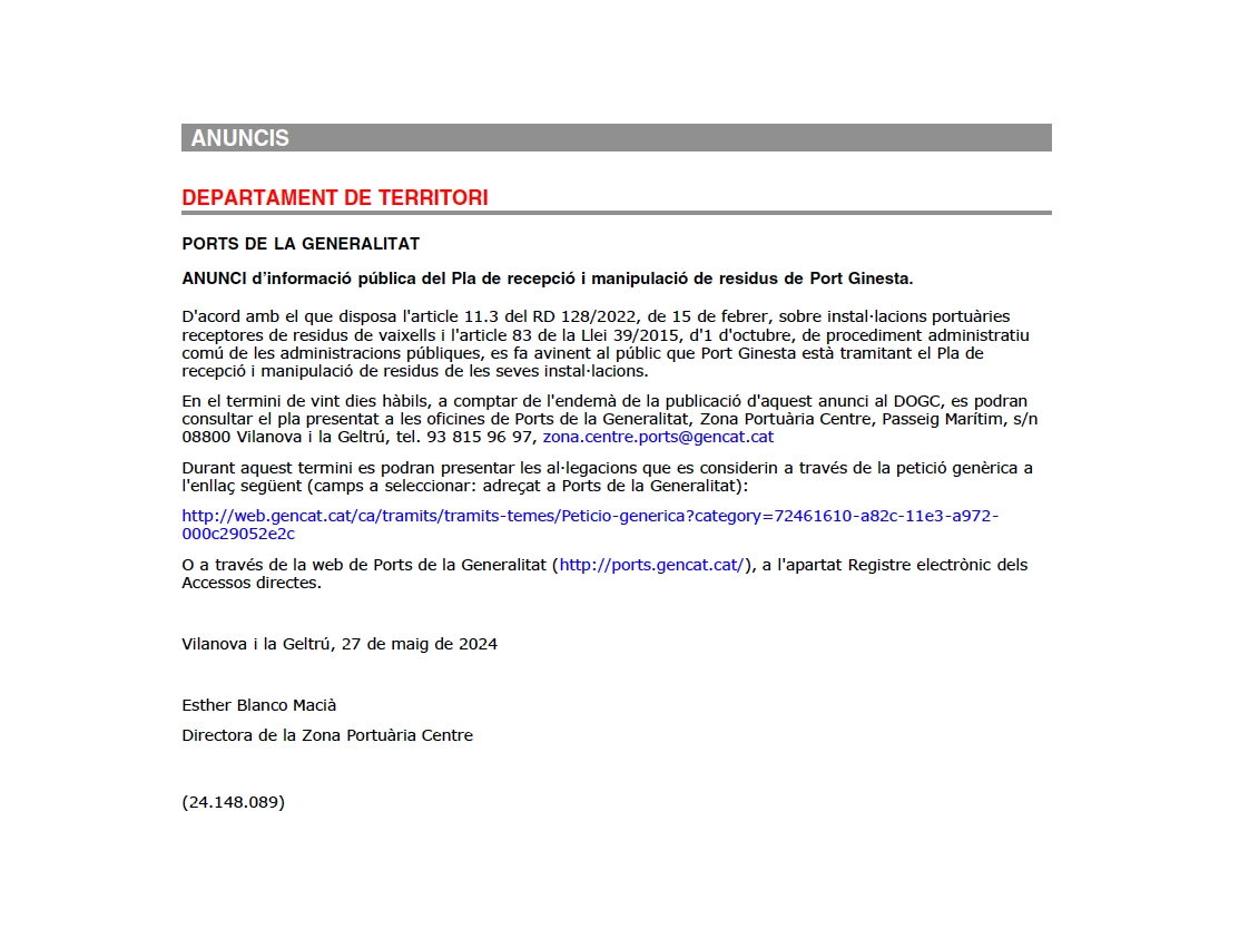 ANUNCI d’informació pública del Pla de recepció i manipulació de residus de Port Ginesta. D’acord amb el que disposa l’article 11.3 del RD 128/2022, de 15 de febrer, sobre instal·lacions portuàries receptores de residus de vaixells i l’article 83 de la Llei 39/2015, d’1 d’octubre, de procediment administratiu comú de les administracions públiques, es recorda al públic que Port Ginesta està tramitant el Pla de recepció i manipulació de residus de les seues instal·lacions.